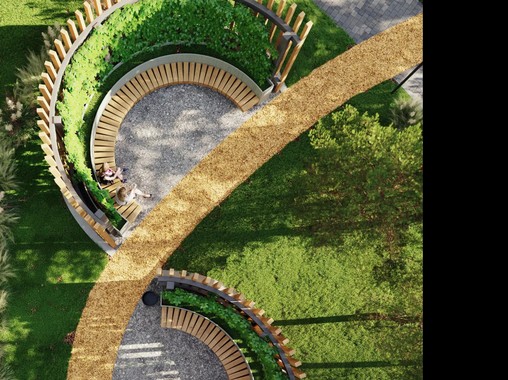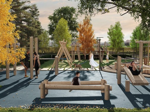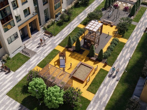 Вертикальная детская площадка с полимерным покрытием, многоуровневое озеленение, мягкое освещение, беседка с чайной зоной для отдыха.